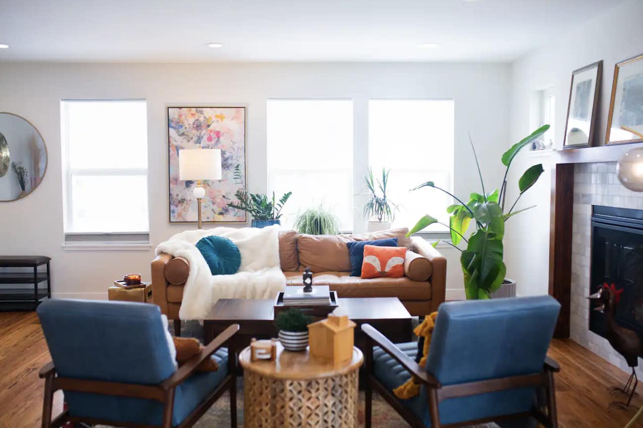On the first floor, you'll find an inviting open space floor plan that includes a living room, dining room, kitchen, mudroom, and powder room. The living area is adorned with a variety of plants and filled with natural light pouring through large windows, creating a cozy atmosphere ideal for relaxing, dining, and entertaining. Step outside to our backyard patio, a perfect spot to unwind.