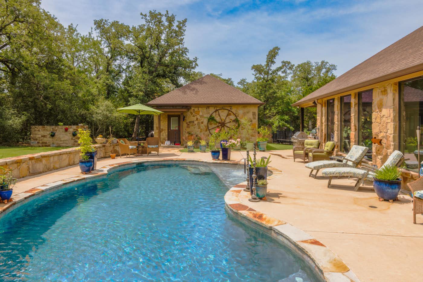 Relax and unwind at this lovely private, quiet backyard oasis that backs up to a wooded area. Splash pad with a bubbler for the smaller kiddos and an excellent rock ledge and waterfall for the bigger kids. Everyone can enjoy the grotto under the waterfall. Several floats, floating chairs, and noodles are available. The large yard gets plenty of sun, but an umbrella and shade are available in the afternoons. Underwater lights for evening swims. A separate pool bath will be disinfected before and after your arrival. A Bluetooth speaker is available for your favorite tunes! Pool towels, bug spray, sunscreen, and a gas BBQ grill can be provided for an additional charge. A perfect place for a party or a family to share an afternoon together. This resort-style pool and accompanying areas give ample room to spread out and enjoy your time at Casa del Gallo.